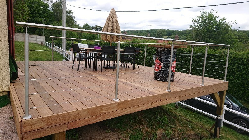 POSE D'UNE TERRASSE SUSPENDUE EN BOIS AVEC GARDE CORPS EN INOX